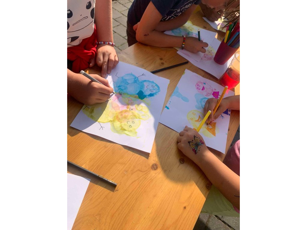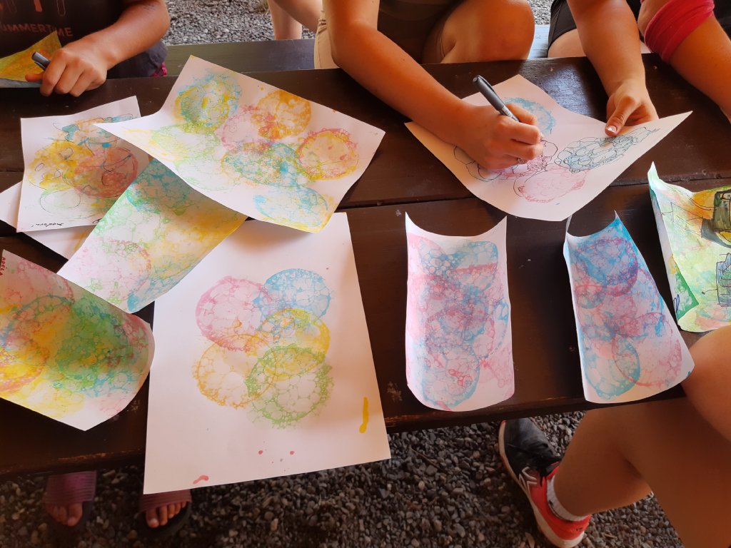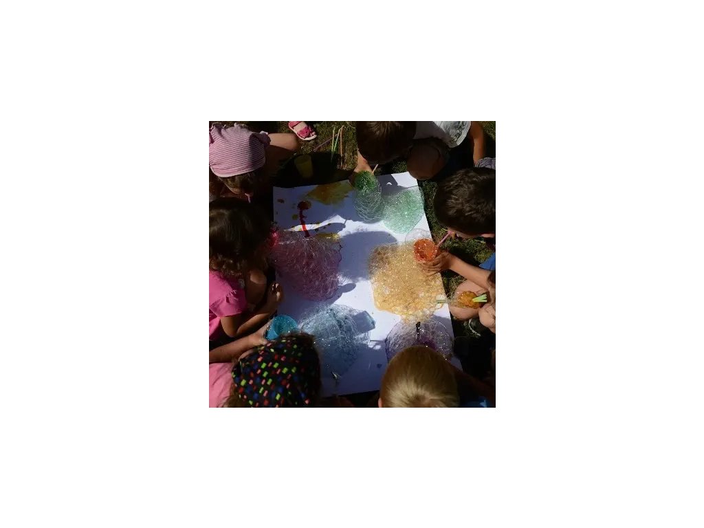 Wie du im Video sehen kannst, gibt es mehrere Möglichkeiten, Seifenblasen zu malen. Entweder man pustet die bunten Seifenblasen mit einem Strohhalm direkt auf das Papier, oder man pustet sie nach draußen und überträgt sie dann vorsichtig auf das Viertel. Das Ergebnis sind wirklich originelle Bilder, auf denen jeder etwas anderes sieht. Anschließend kann man sie mit Buntstiften oder Markern vervollständigen.